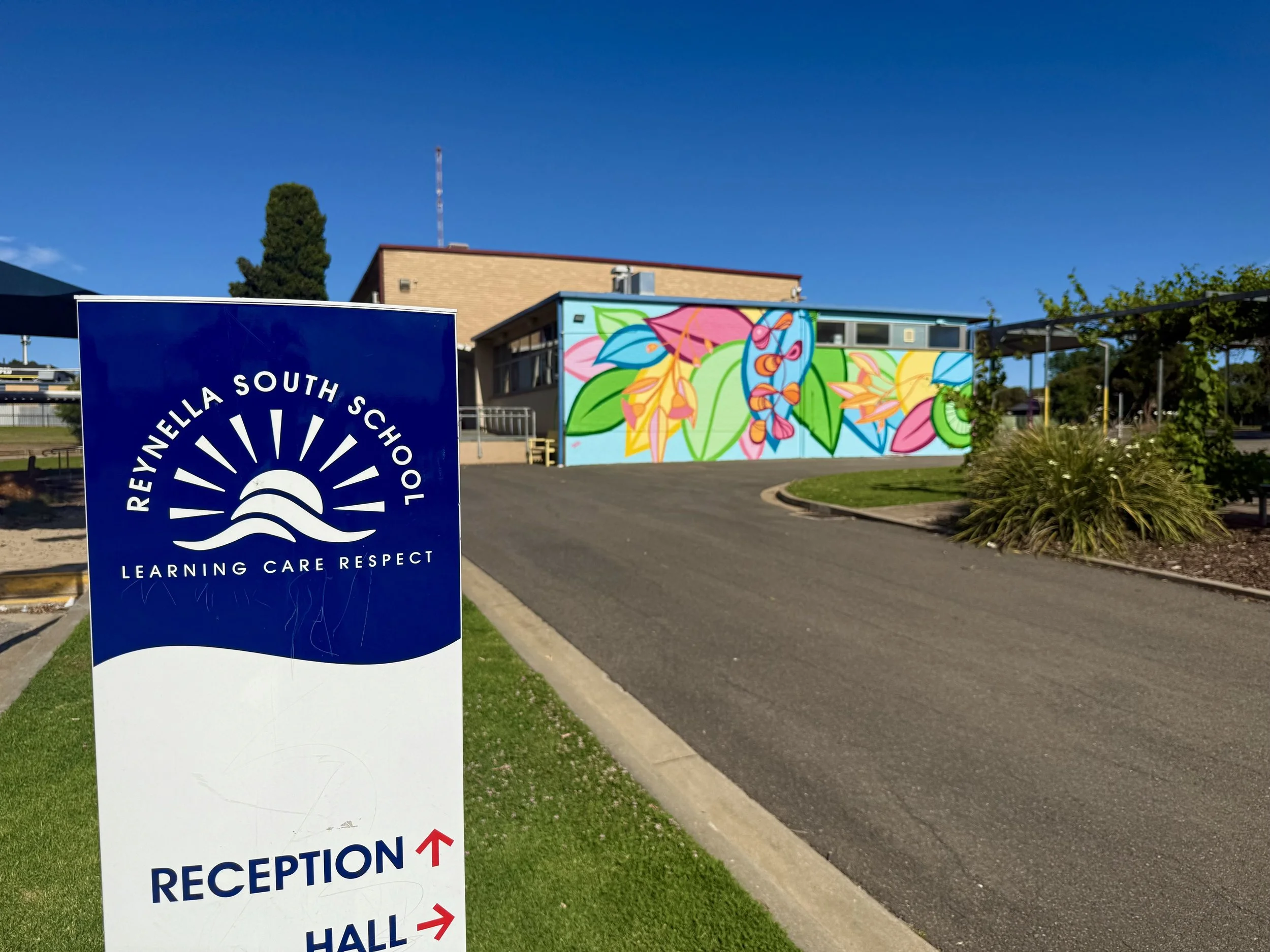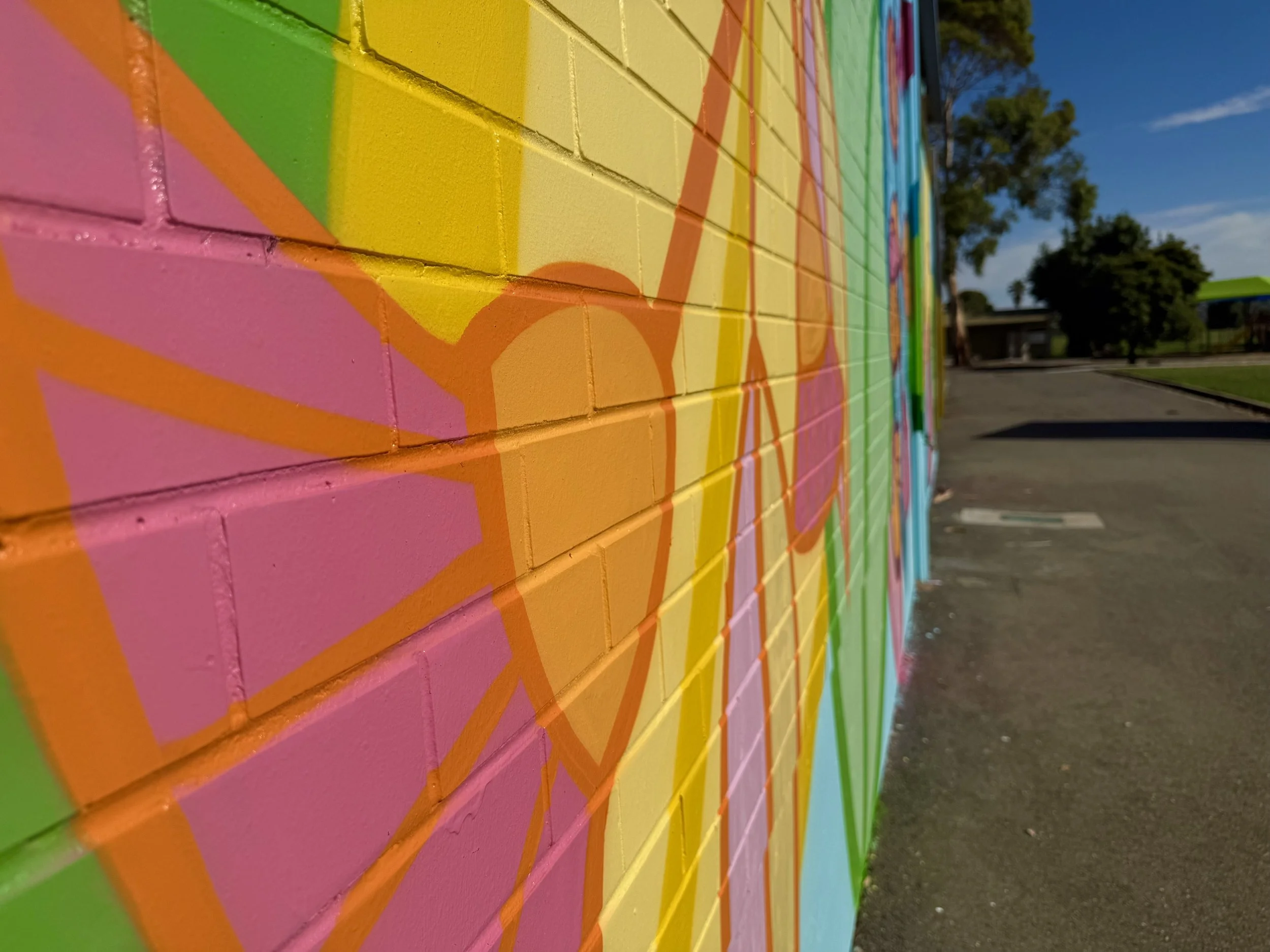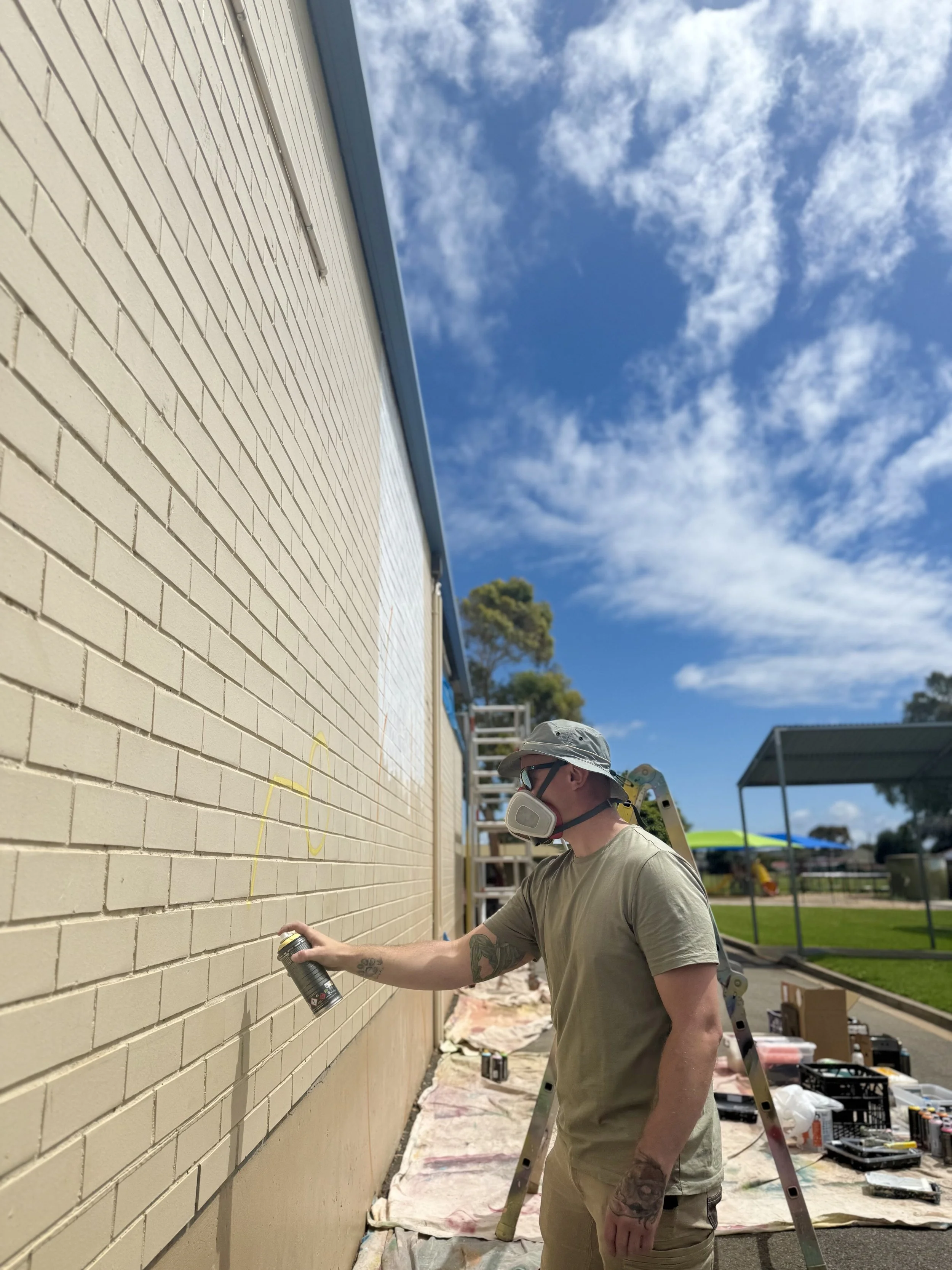 In December 2025, I had the privilege of painting a mural at Reynella South Primary School. The school had already organised the perfect location, but there was one small challenge, an old, unused window in the middle of the wall. Before I arrived, the team arranged for it to be professionally bricked up. Now that’s commitment to wall prep!